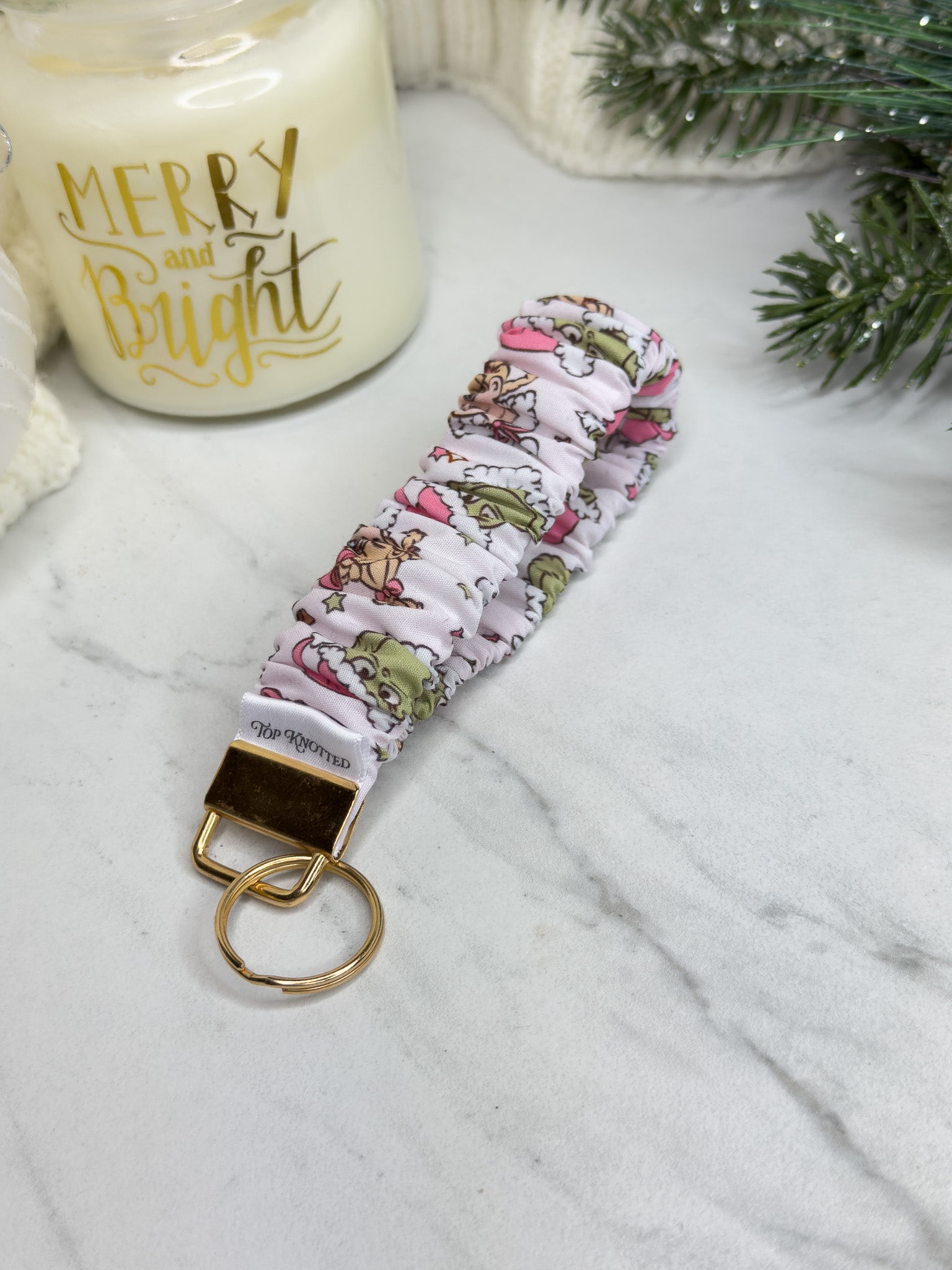 Unlike standard fabric wristlets, this scrunchie design offers superior stretch and softness, making it more comfortable to wear all day without digging in or losing shape. Accented with polished gold hardware, this wristlet transforms your everyday keys into a cute accessory. Perfect for those who love a touch of luxury in their everyday essentials.