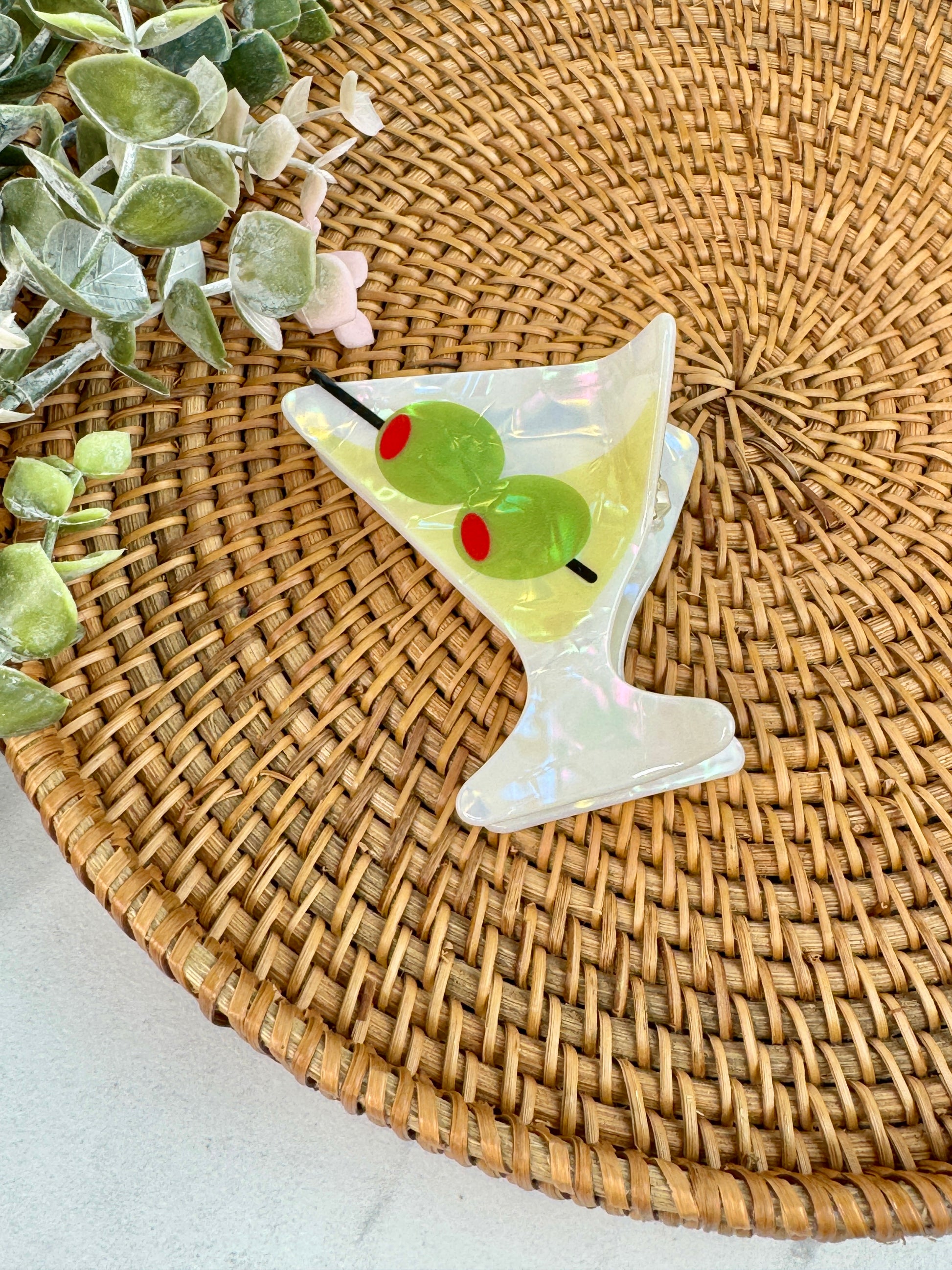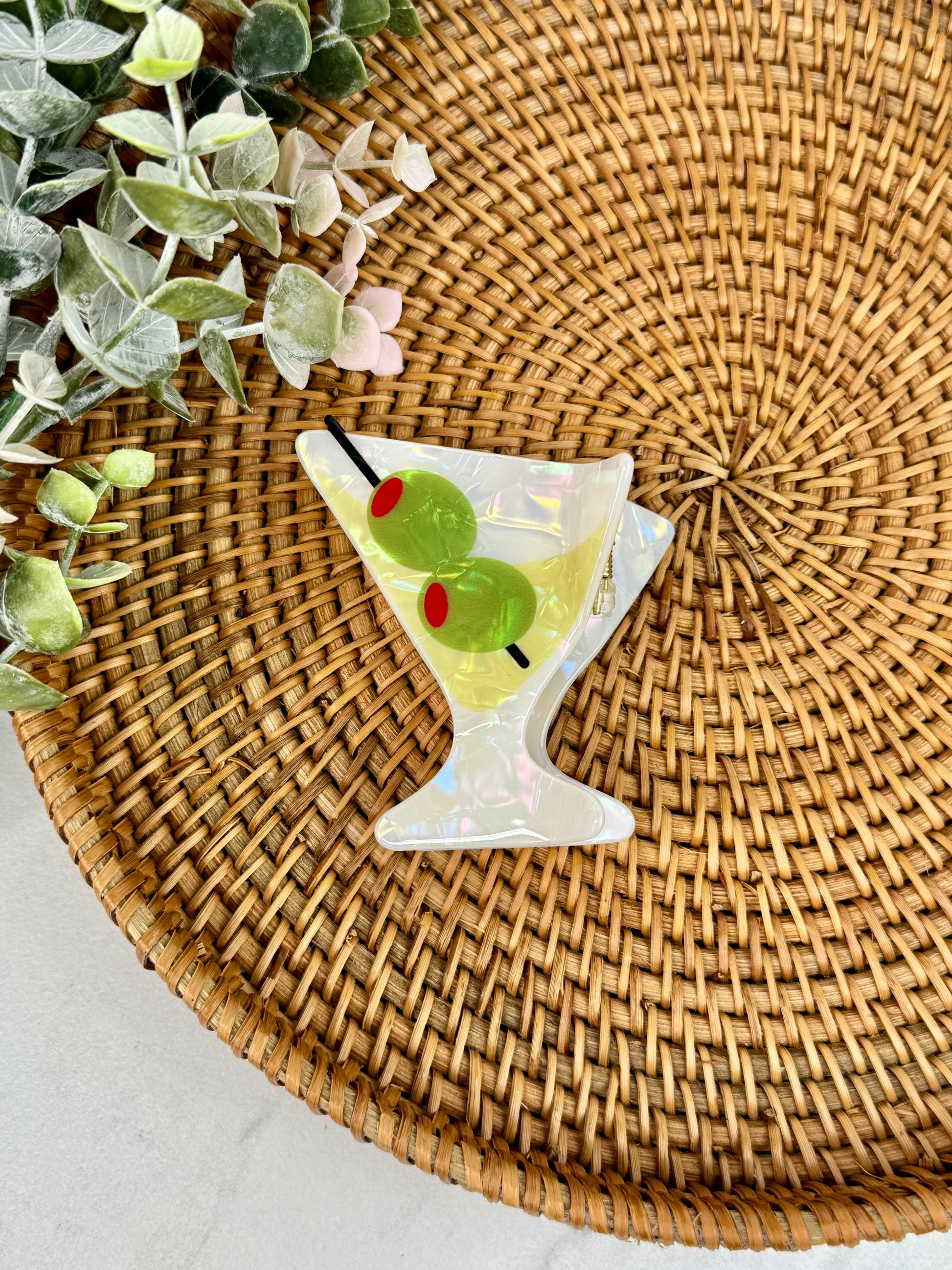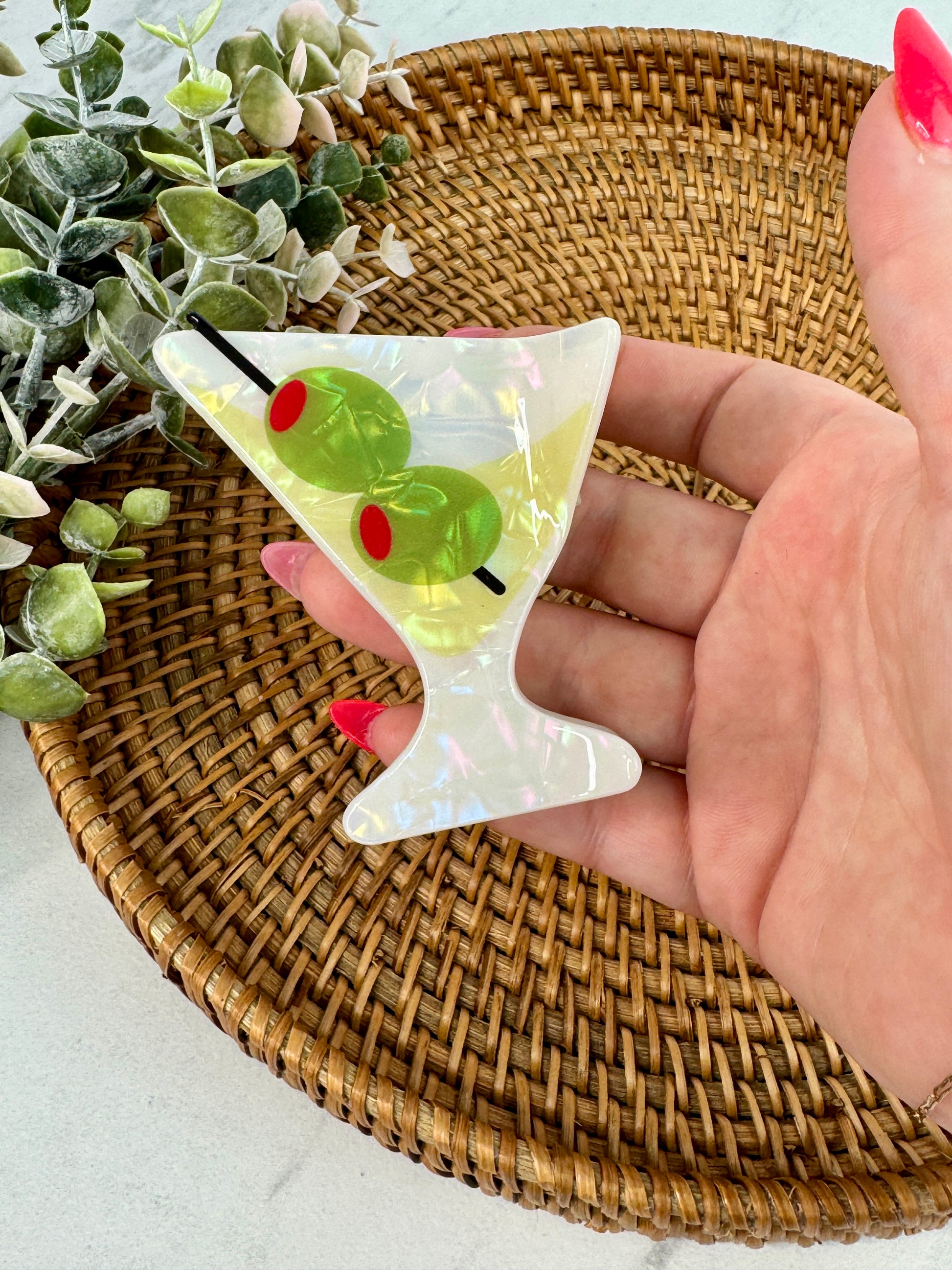 Cheers to bold style! This martini-shaped claw clip adds a splash of sass to your look with its sleek cocktail glass design—complete with an olive garnish. Perfect for parties, girls' nights, or anytime you want your hair to match your vibe. A fun, flirty accessory for the ones who like their style shaken, not stirred.