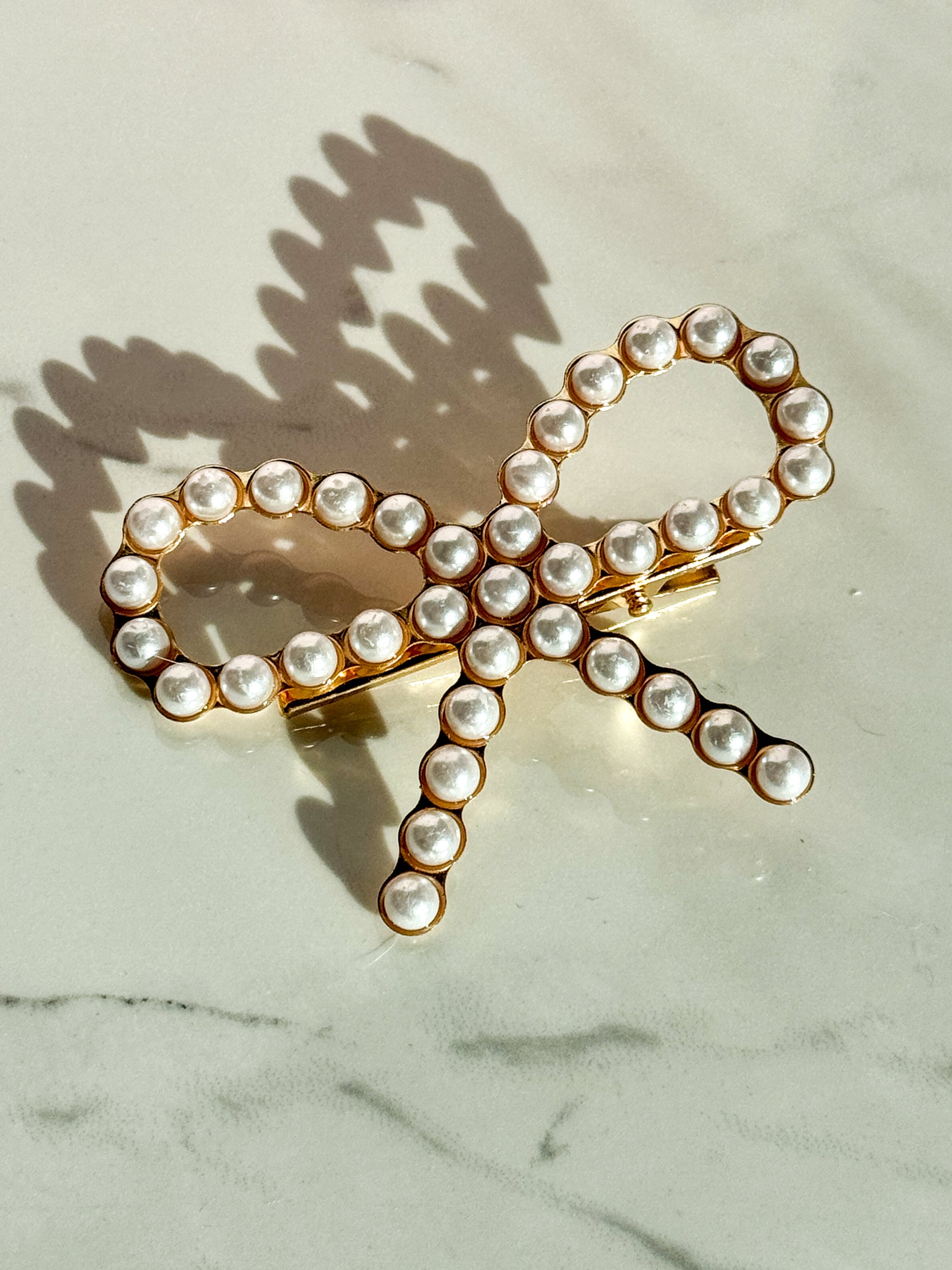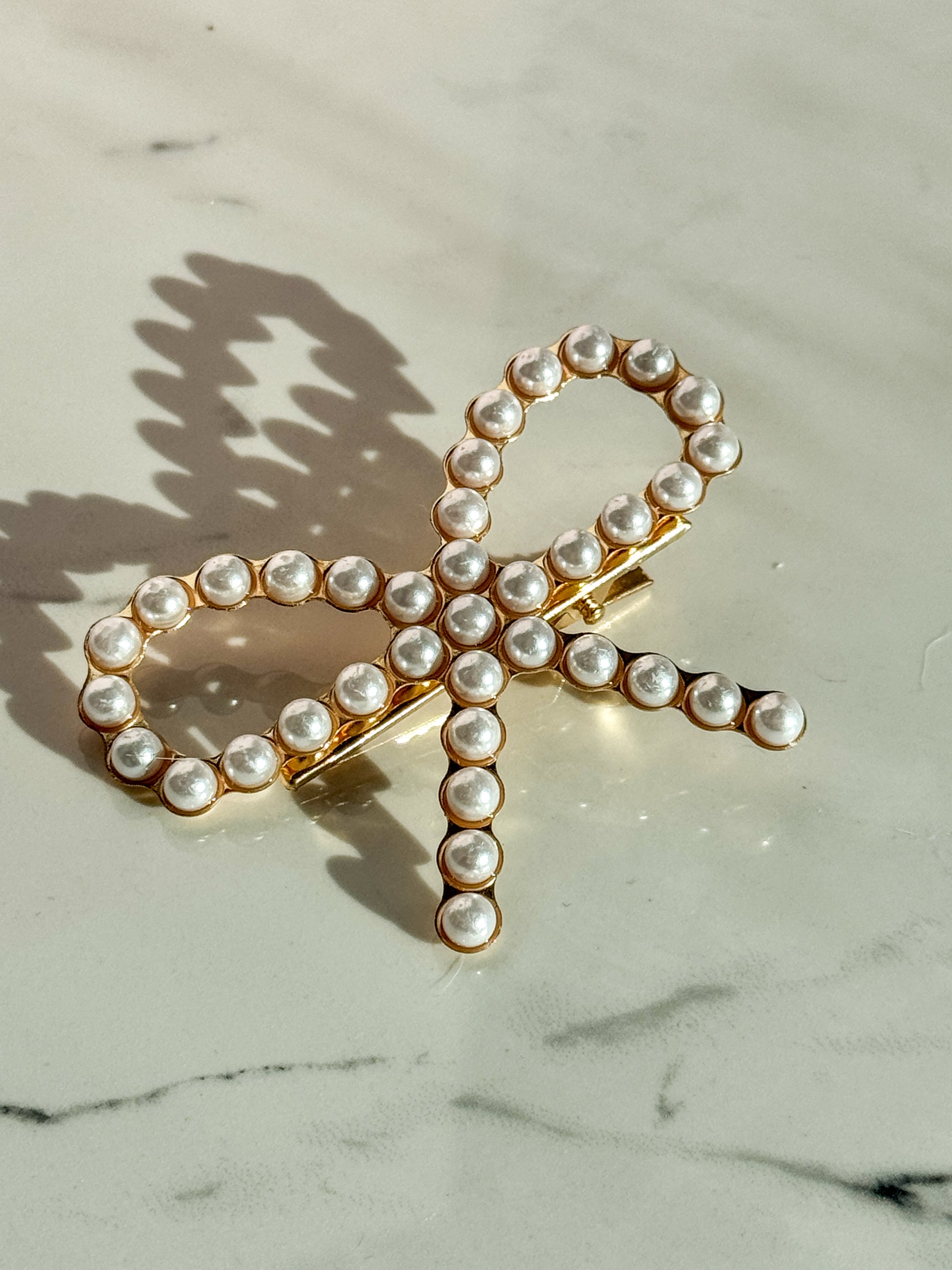 A delicate twist on timeless charm. The Pearl Kiss Bow Clip features a graceful gold metal bow silhouette adorned with pearl bead details—perfect for finishing any look with a soft, romantic touch. Whether you're pinning back loose strands or adding sparkle to an updo, this clip is all about effortless elegance.