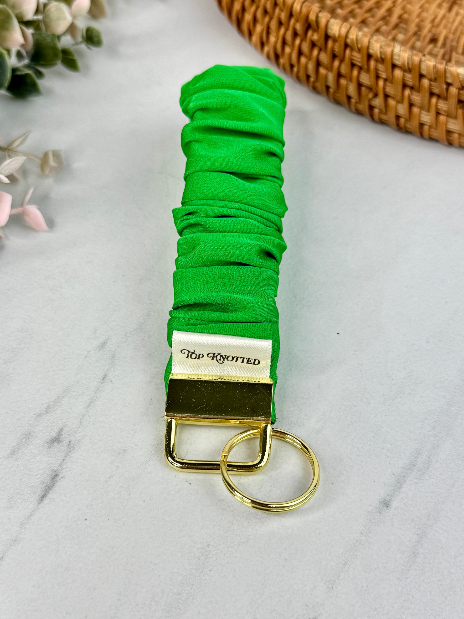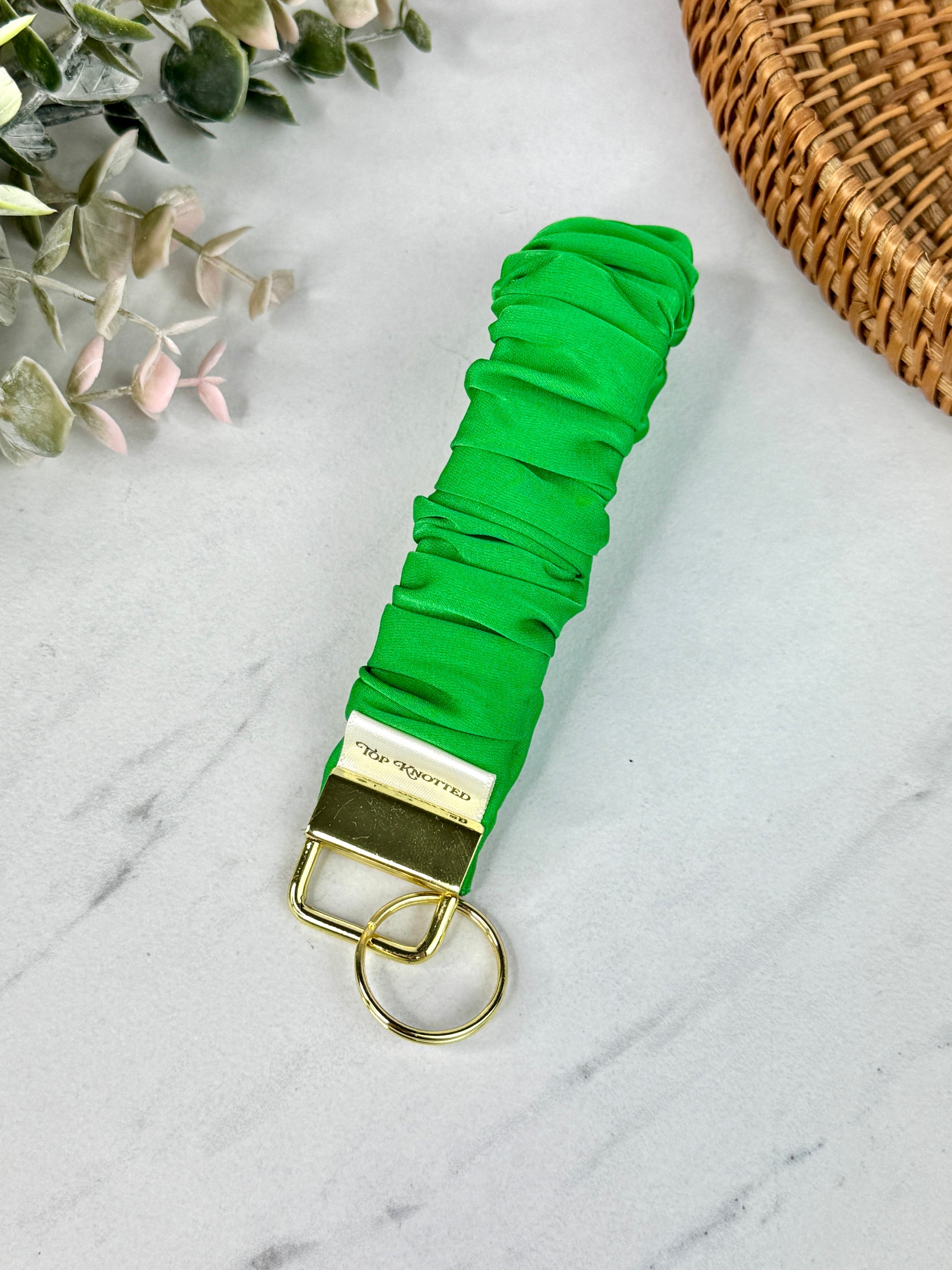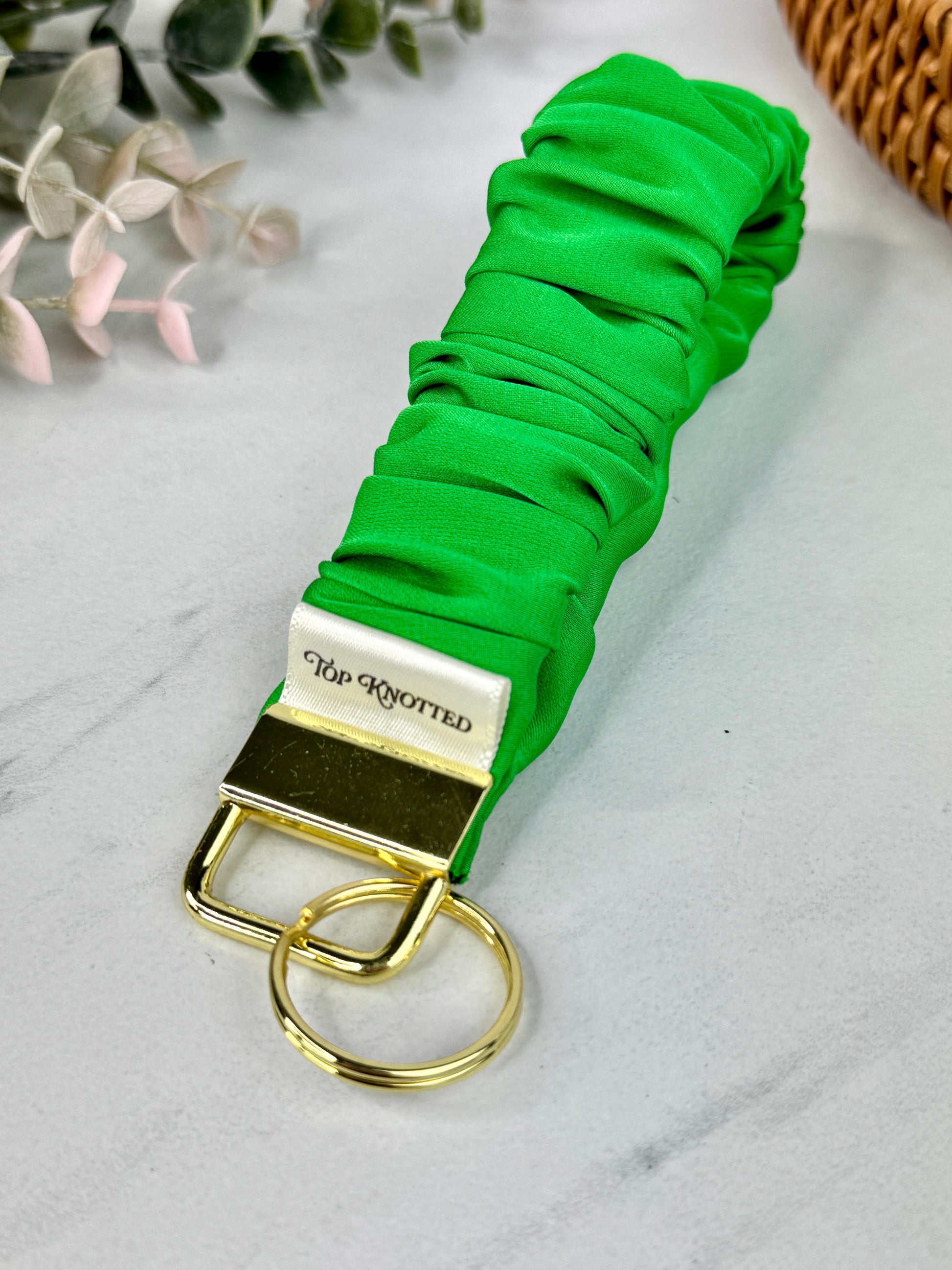 Unlike standard fabric wristlets, this scrunchie design offers superior stretch and softness, making it more comfortable to wear all day without digging in or losing shape. Accented with polished gold hardware, this wristlet transforms your everyday keys into a cute accessory. Perfect for those who love a touch of luxury in their everyday essentials.
